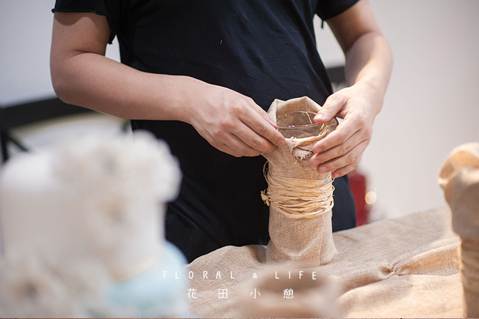1.作品难点主要在于花材与物品的搭配、装饰,所以在选择花材和物品时,尽量以白、绿两种颜色为主,让作品的整体呈现更加素雅洁净,细节之中均充满了生活的质感。