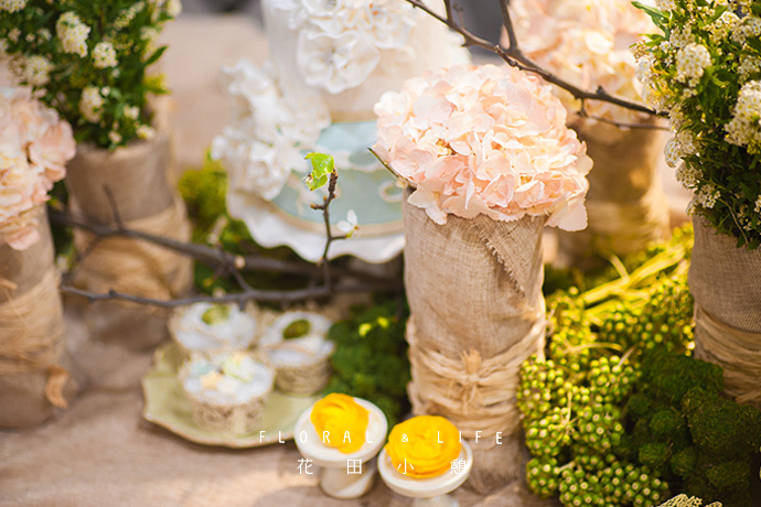 首先,我们可将绣球花稍作处理,选用几朵质地较佳的进行初步的装点,简约自然跃然呈现。而