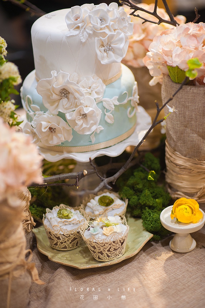除了小熊的搭配外,我们还可以放一些其他大型的甜品进行摆设。像花瓣的样式配上可口的翻糖蛋糕,美美的造型也会让作品看起来更加甜白诱人!