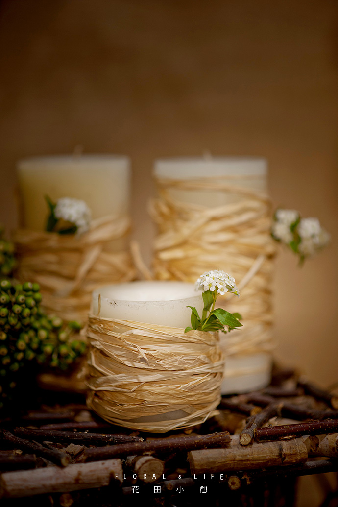 如果你也想做一些特别的创意,可以选用拉菲草将蜡烛缠绕,再配上一朵精致的小花.蜡烛可在甜品的四周摆放三两个,让普通的生活用品瞬间变得俏皮有趣!