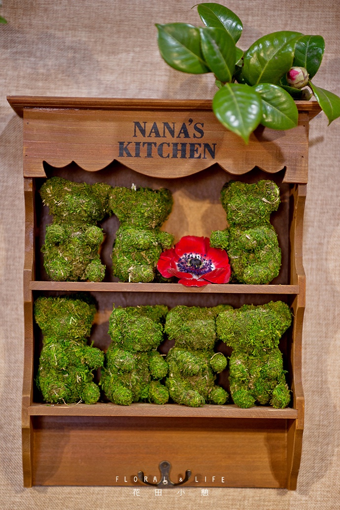 花材搭配好之后,便是我们最亮眼的明星“花田小熊”上场了。“花田小熊”由苔藓制作而成,看上去娇小可爱。同时,我们还罗列出了多种用法供大家参考搭配。比如:将花田小熊
