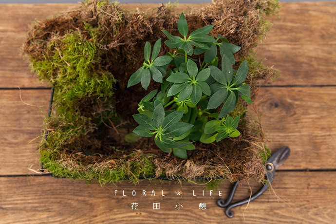 将四周多余的草皮折回到篮中,遮盖住植物的花盆。