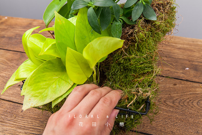 将金色绿萝摆放进篮子中,注意与鸭脚木之间留有一定空隙。