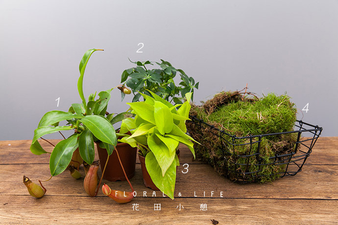 将猪笼草摆放进篮中后,准备用草皮对空隙进行填充。