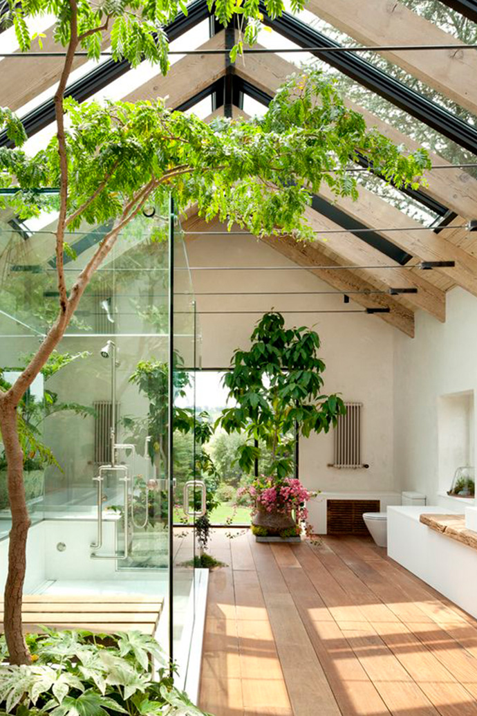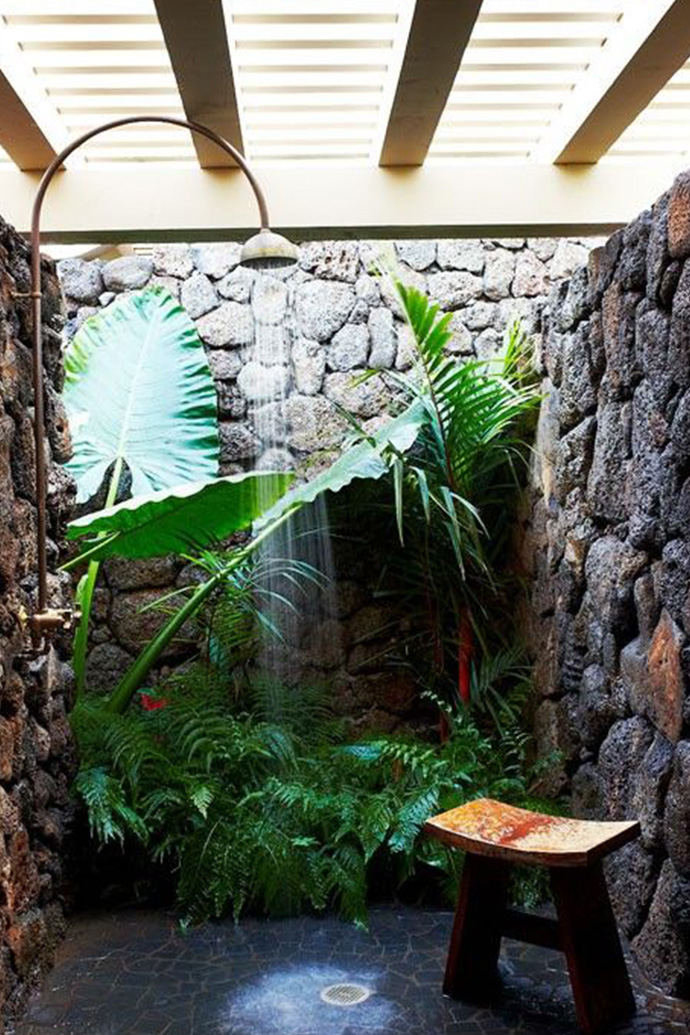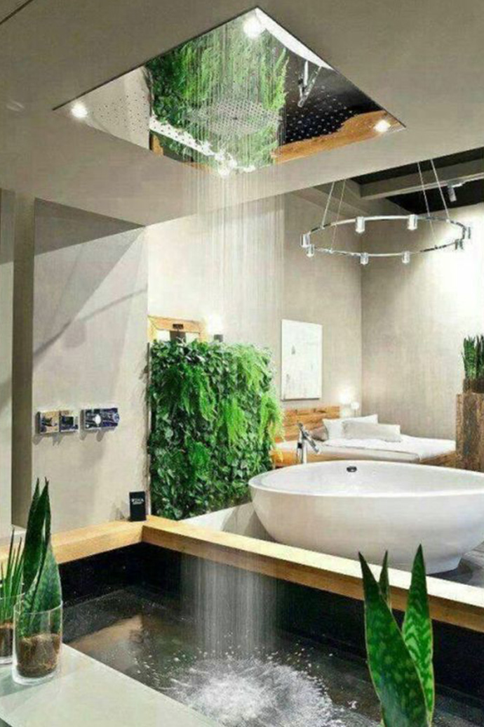 热带式的浴房,有很多自然元素,比如在淋浴间里栽种阔叶植物,半天井式的开放,让阳光透入,就像沐浴在森林里一样.