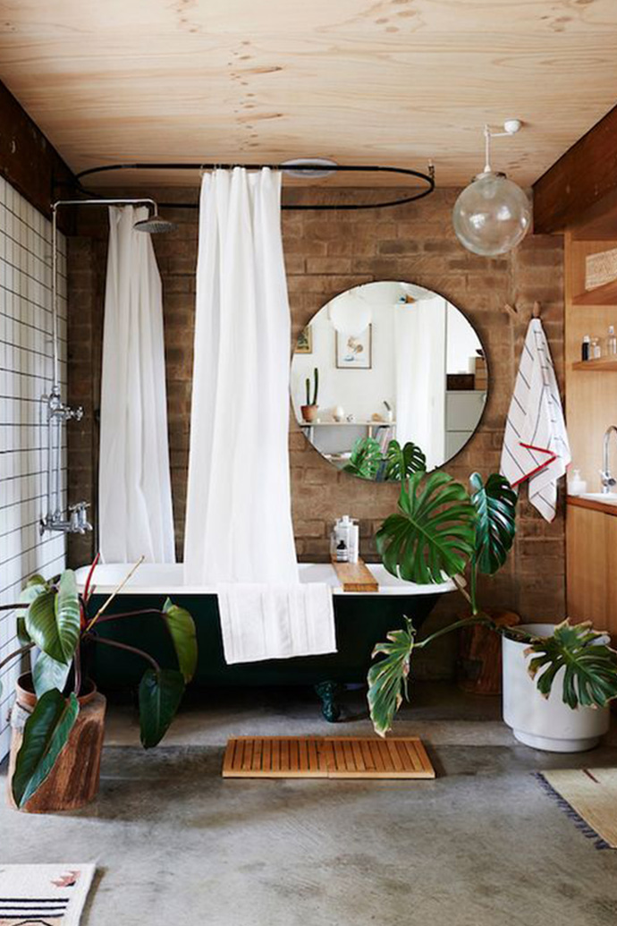 在浴室“种草”,可以根据喜好决定植物的品种,利用空间来摆放绿植,可以选择阔叶植物、垂吊植物等.打造出一个茂密的丛林.植物又有净化空气,释放氧气的功用
