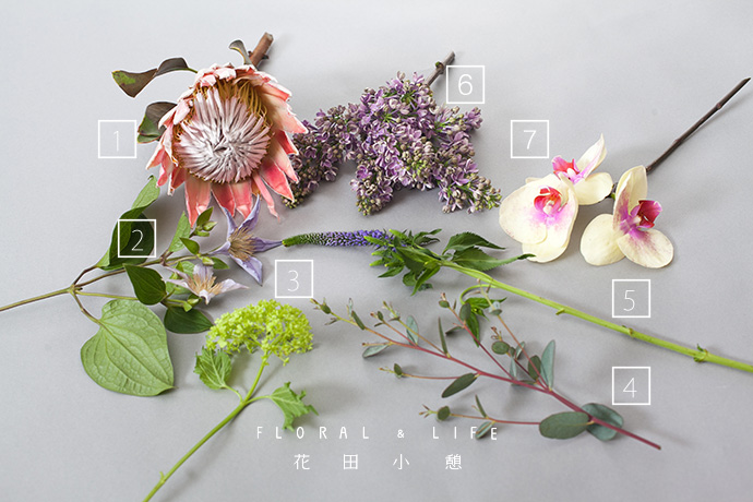 最后在帝王花的两侧补入铁线莲和蝴蝶兰,一份充满“暖春”意境的作品完成。