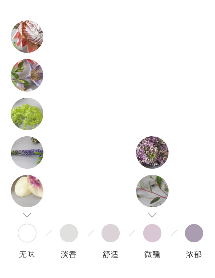 为了方便大家在花材搭配时的选择,花田小憩特设香味等级图谱,供大家在学习过程中了解更多植物的属性,以方便作品选择更适合的空间位置陈列。