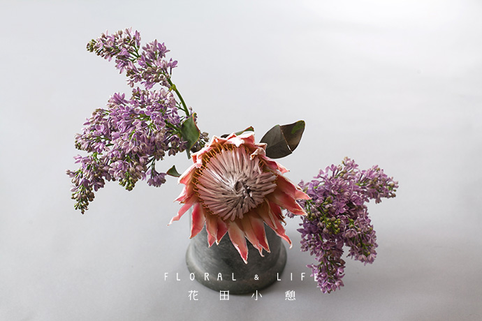 作品进行构图时,可在帝王花两侧插入辅助的木绣球和鼠尾草,逐步丰满和完善造型。两种花材进行搭配时,需要和丁香相互协调,构图错落有致,保持整体造型的舒适感。