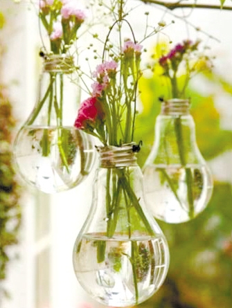 将灯泡吊挂起来注满水插上一支支的鲜花,一堆高低错落的排列在一起,简直就是最靓丽的风景。也要注意及时换水哦,以免水分浑浊破坏那份晶莹剔透的美。