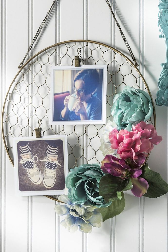 在平的铁圈网上用几朵布艺花做点缀,在网格中用小夹子固定相片或者便条,挂在家里的玄关处,是不是非常别致。