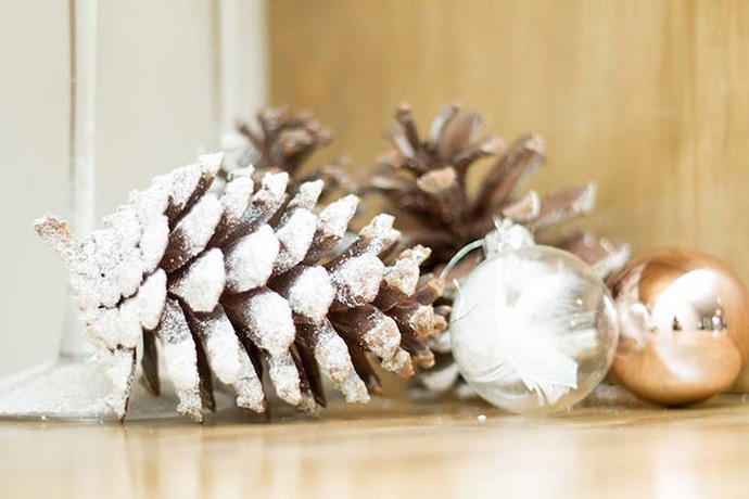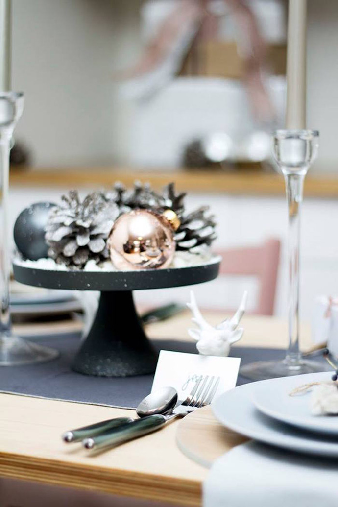 在搭配设计上,可以直接用染了金粉的松果装饰空间,餐桌以灰、黑、金三色为主。总之,金属圣诞派对颜色简单,没有经验的人可直接上手。这种装扮设计适合原木风家庭。