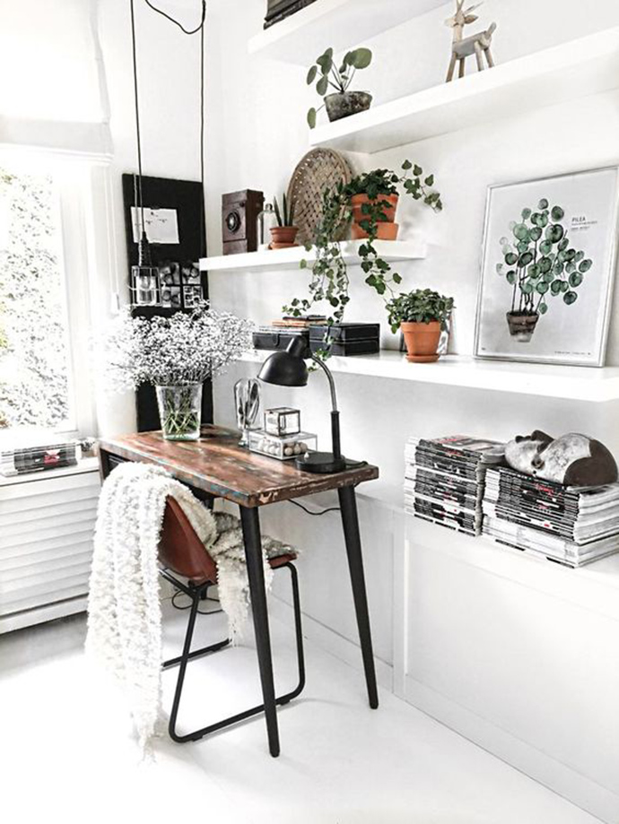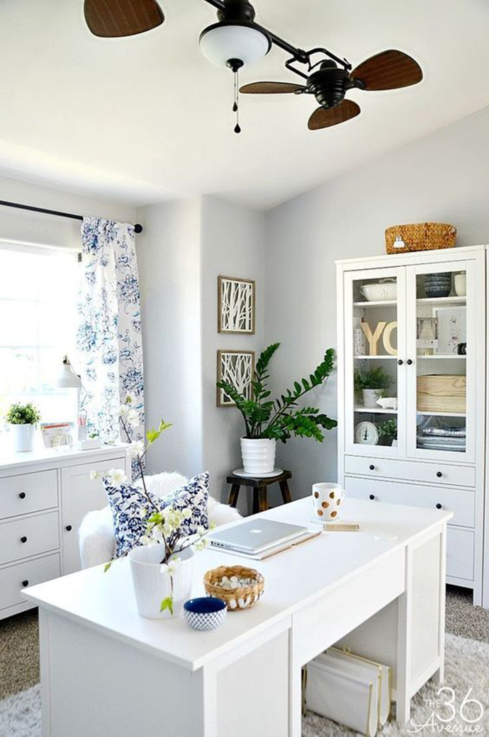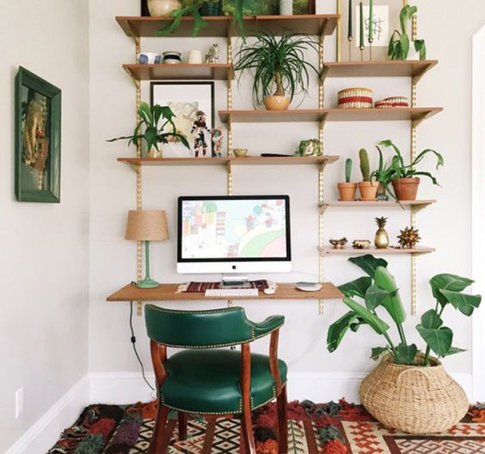 书房是读书和办公的场所,因此布置时应注意制造一个优雅宁静的气氛。在书架上方靠墙处摆盆悬吊植物,使整个书房显得文雅清心。此外,书房可摆放以简洁为主的东方式插花。
