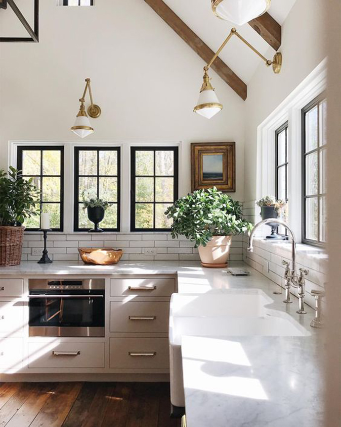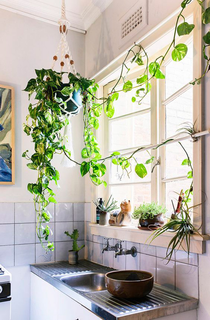 厨房装饰厨房一般面积较小,且设有炊具、橱柜等,因此摆设布置宜简不宜繁,宜 小不宜大。厨房温湿度变化较大,应选择一些适应性强的小型盆花放置在食物柜的上面或窗边。还可用小红辣椒、 葱、蒜等食用植物挂在墙上作装饰。