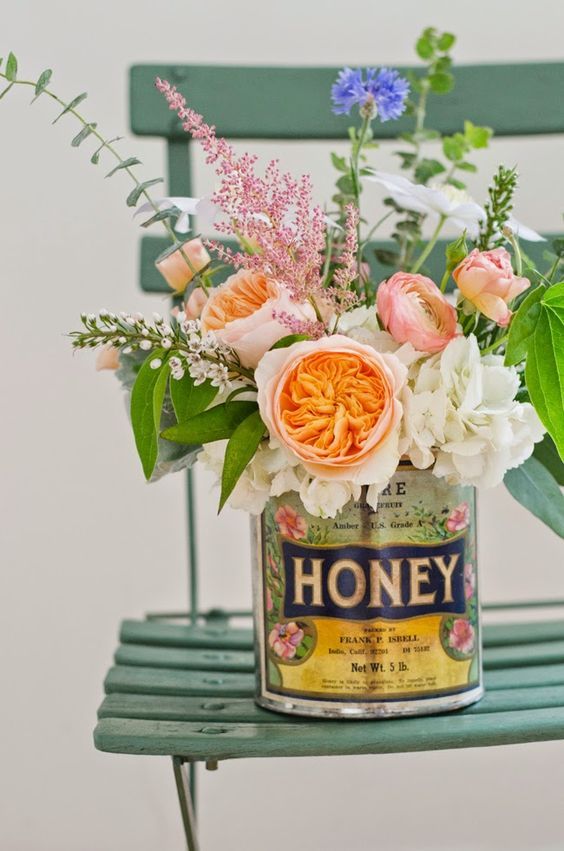 一些具有设计感的罐头瓶、果汁瓶用完后都可以作为花器使用,随意地搭配自然风格的花草,充满了复古感,同时更加有趣、时尚。