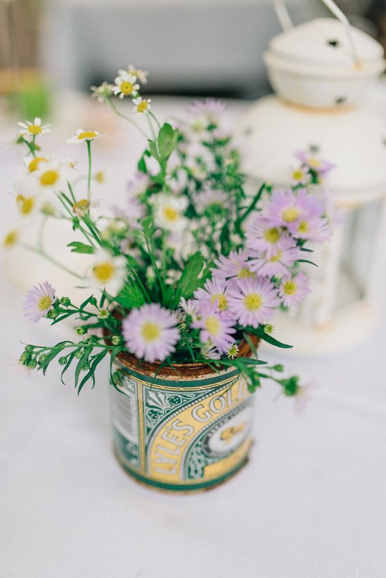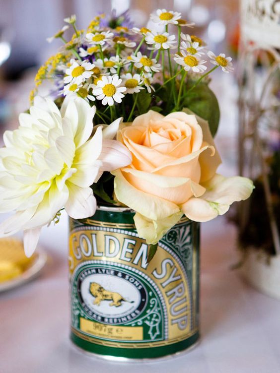 复古金属瓶一些具有设计感的罐头瓶、果汁瓶用完后都可以作为花器使用,随意地搭配自然风格的花草,充满了复古感,同时更加有趣、时尚。