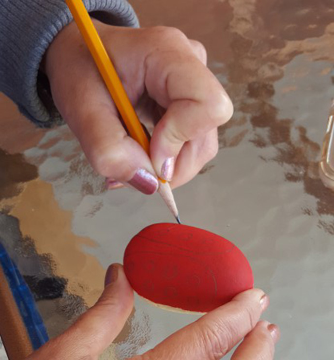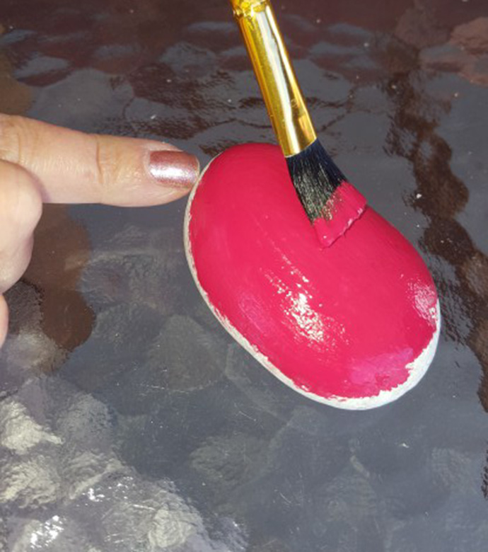 首先,选出合适的石头:鸡蛋大小即可,椭圆状为佳。然后用刷子蘸取红色的丙烯颜料将石头表面全部涂成红色。