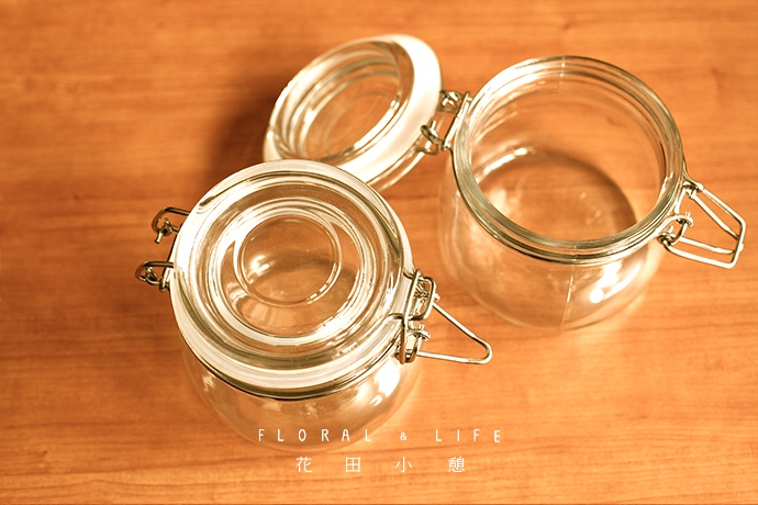 自然材质的花器有着清新、素雅的效果,精选一些质地较好的玻璃罐,便于作品搭配造型. 此类容器可在宜家等家居店进行购买。