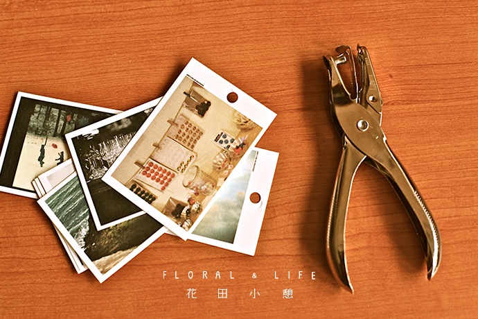 用打孔钳在照片的尾部打一个圆孔,便于拉菲草的捆系。而制作过程中须避重就轻,防止损坏照片的原有形状。