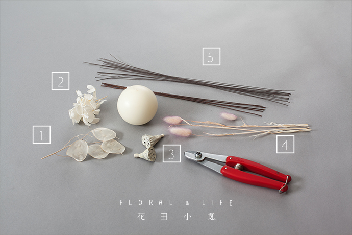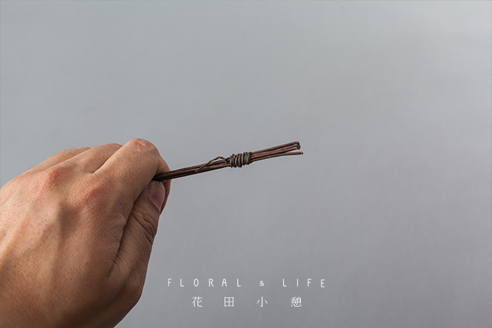 为了方便大家在花材搭配时的选择,花田小憩特设香味等级图谱,供大家在学习过程中了解更多植物的属性,以方便作品选择更适合的空间位置陈列。创作作品的骨架时,可选用粗细不同的铁丝进行构建。把6支22号铁丝用26号铁丝进行捆扎,顶部保留3-4厘米便于造型。