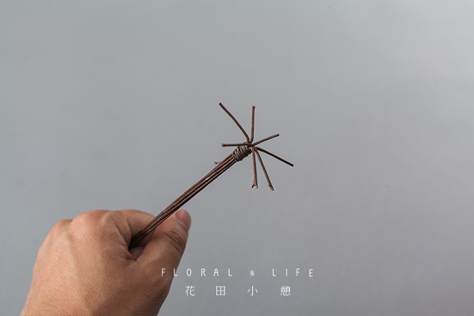创作作品的骨架时,可选用粗细不同的铁丝进行构建。把6支22号铁丝用26号铁丝进行捆扎,顶部保留3-4厘米便于造型。