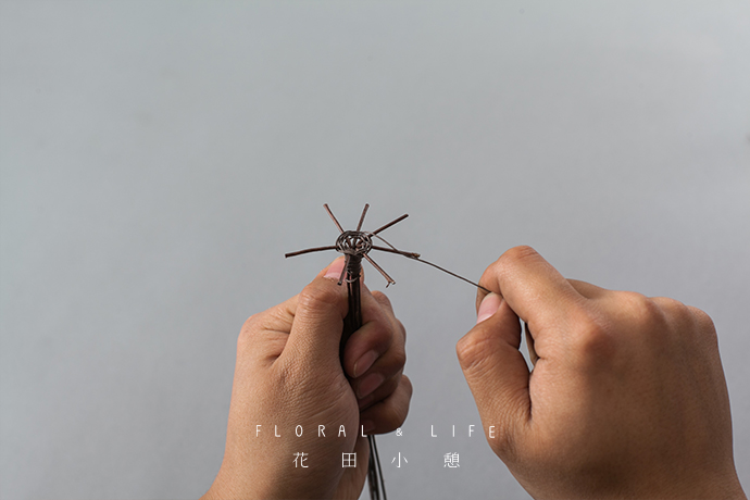 底盘铁丝进行缠绕时,尽量保持密集、紧凑,保证作品摆放中的“稳固不倒”。同时将上方以“蜘蛛网”的形状进行缠绕,完善整体的构架。