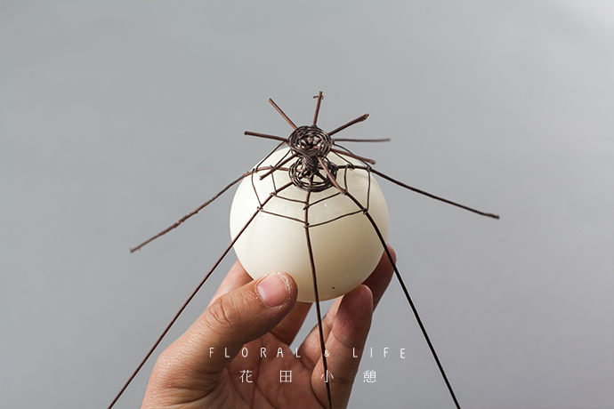 花器的形状是组合作品重要的一环,为了提升其稳固性,可通过使用26号铁丝,在“八爪鱼”由中间向外进行缠绕,保证底座支撑的牢固程度。