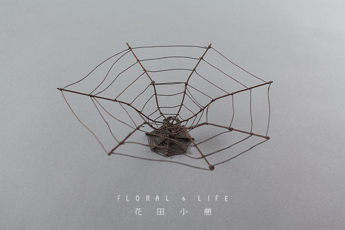 在作品的基本构图上,可采用“不对称”的自然构图形式. 将形状独特的兔尾草,以不受任何形式和框架限制的方式插制在“蜘蛛网”上,突显出清新自然感觉的同时,也能充分发挥出创作着的艺术才能。