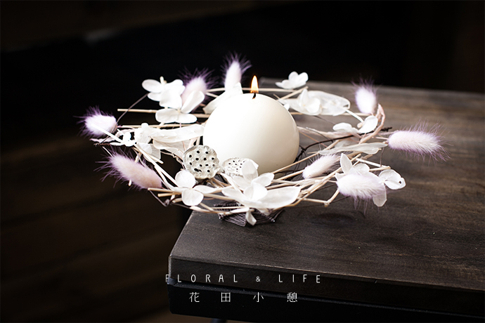 为了保证视觉上的“中心”,可根据环境主题和美观上的需要,在“蜘蛛网”四周置入轻盈的永生花和造型独特的莲蓬,保证形状上的积聚,整体构图的完善,突出摆放蜡烛的中心部分。
