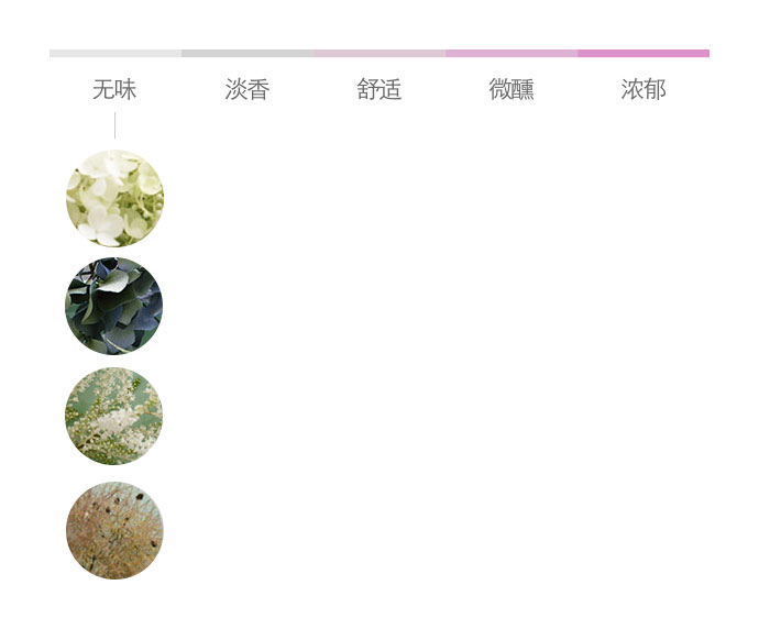 为了方便大家在花材搭配时的选择,花田小憩特设香味等级图谱,供大家在学习过程中了解更多植物的属性,以方便作品选择更适合的空间位置陈列。