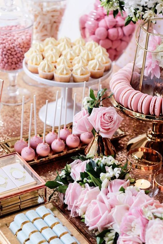 除了蛋糕外,尽量多准备一些例如曲奇、布丁杯、马卡龙、棉花糖等其他种类的甜品供大家挑选,口味最好也有变化。甜品桌的关键是要让食物看起来丰盛,因此选择一款主蛋糕,再选2-4款精致又方便带走的甜品为陪衬,放置于托盘、蛋糕座或架子上,就可以营造一种丰富满载的感觉了。
