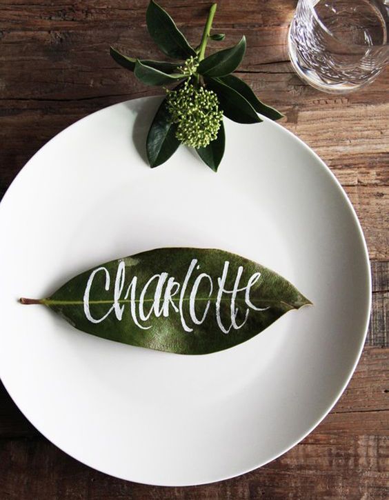 在胶带、卡片、叶子或餐盘上写出每位宾客的名字,为大家安排一个专属座位。这样用心的设计不仅可以让宾客眼前一亮,深刻印象,还能使婚礼井然有序,更加出彩