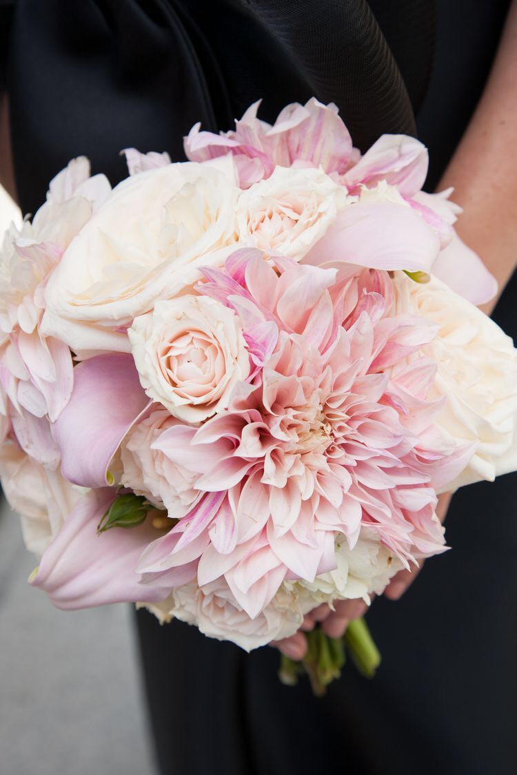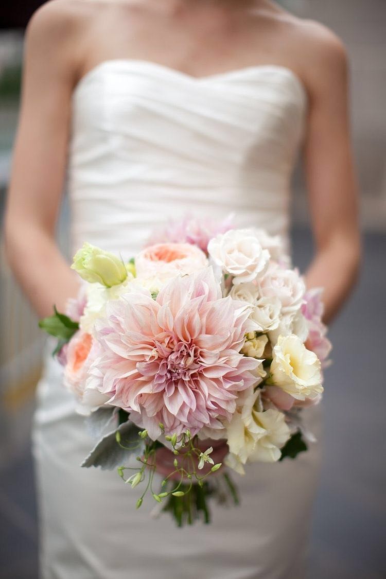 大丽花是一种非常美丽惊艳的花材,超大的花头显得热情而奔放,不管是与同色系的其它花材搭配,还是与颜色对比反差大的叶材搭配,它总能够在花束中夺得一席之地,加之,现在越来越多的新娘都喜欢在手捧中添加上大型花朵,因为这样能够让手捧花束整体看上去层次感更加突出。