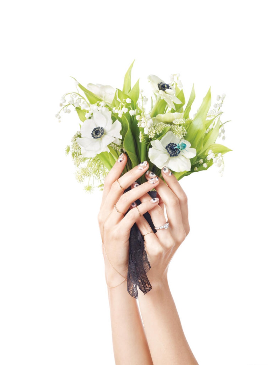 你手捧着花束走向你的爱人,美甲这样的细节会给你加分。吧你的捧花打样照片拿给你的美甲师,让她发挥一下,为你设计一套可以搭配捧花的指甲造型。