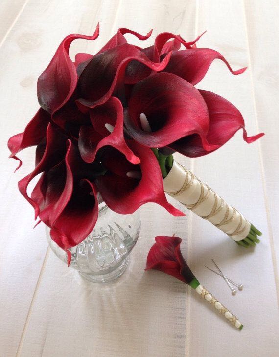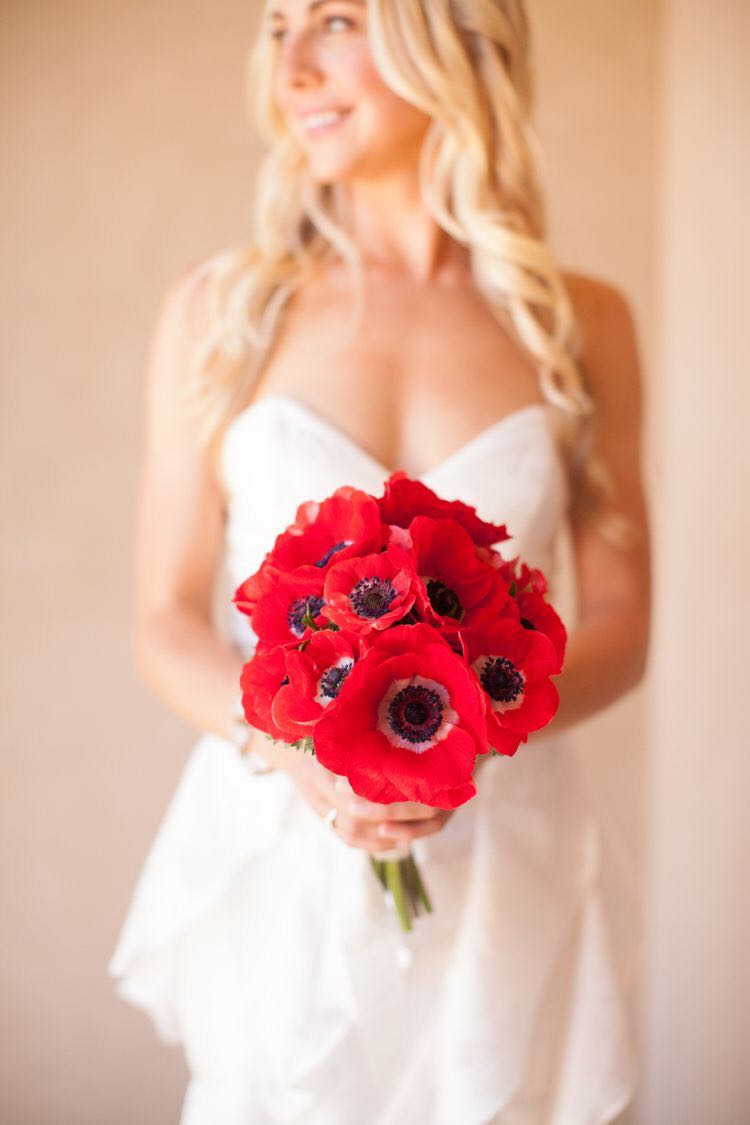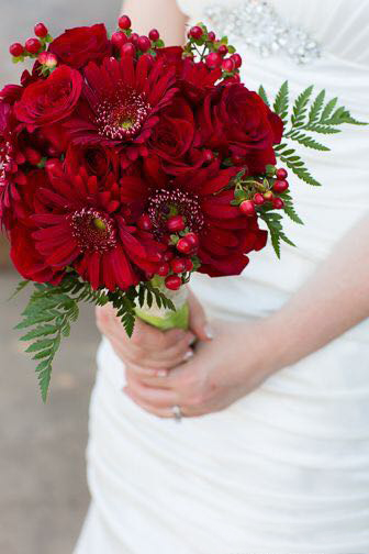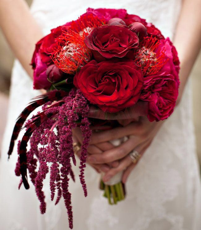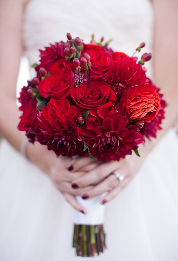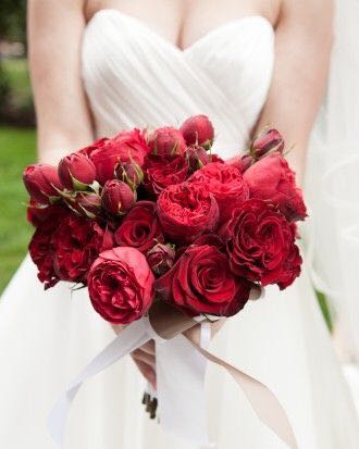 说到红色手捧花,大多人心目中可能首先想到的就是当然就是红玫瑰啊,简单粗暴,热情似火而又代表了爱情。但其实,红色系手捧也是有很多选择的,搭配得当,跟白色婚纱搭配起来既漂亮吸睛,更是寓意美好。下面就简单介绍几种: