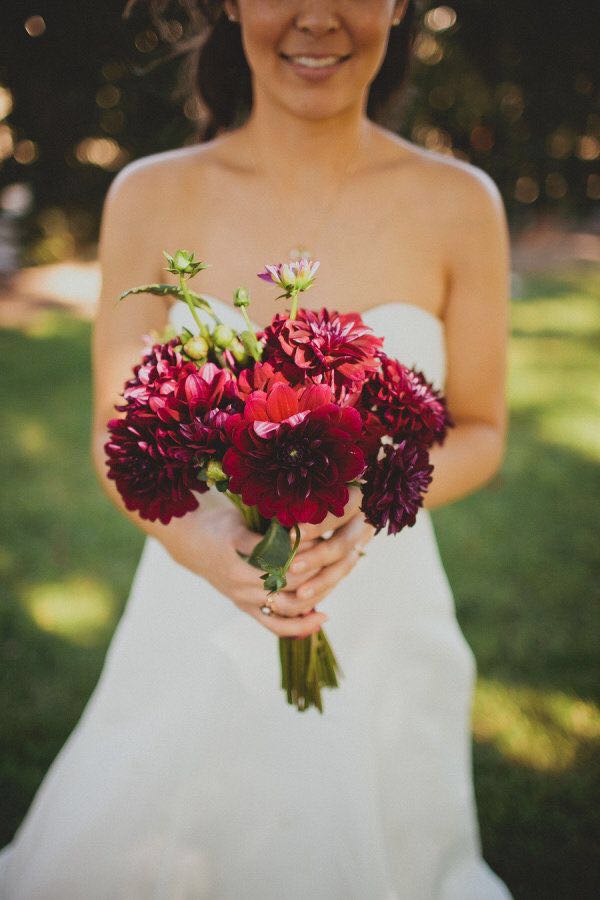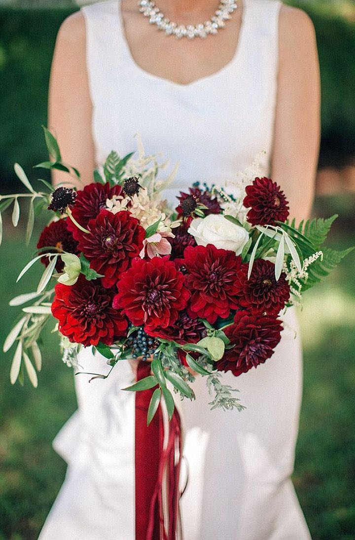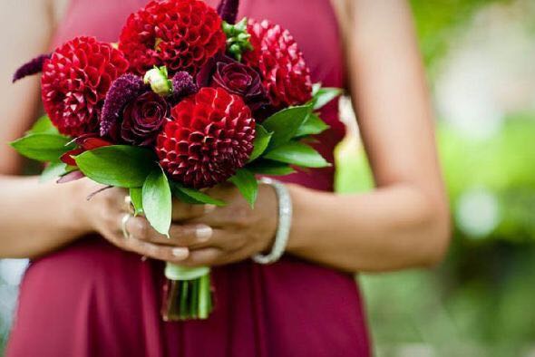 大丽花别名天竺牡丹。原产于墨西哥,墨西哥人把它视为大方、富丽的象征,因此将它尊为国花。其花朵非常大,鲜艳的红色大丽花用来做婚礼手捧自带一种富丽感。