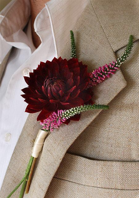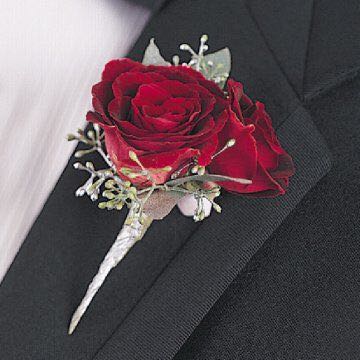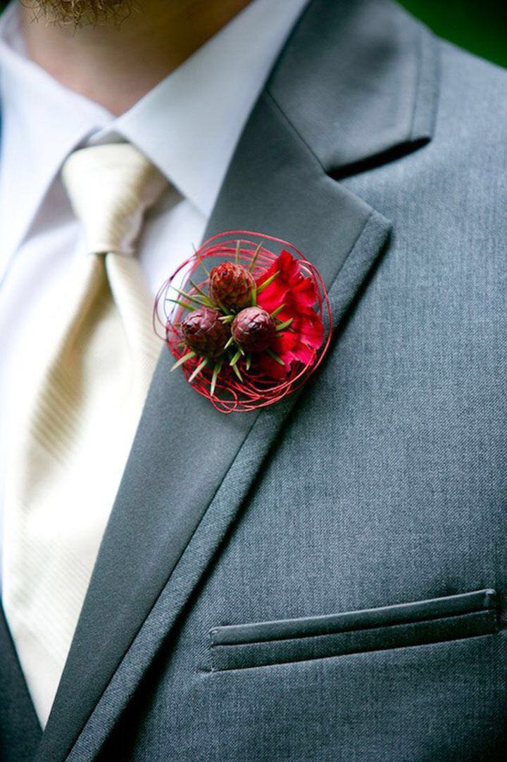 说完红色手捧,再来说说新郎的胸花——假花真的low爆了,一定要鲜花胸花才高端大气上档次,说到这里,新婚当天,新郎的胸花当然要配合新娘的红色手捧花了,但是要注意的一点就是:红色本身属于比较艳丽的颜色,跟小胸花搭配的花材适合用一些饱和度相对低一些的花材,这样既能突出红色的主题,同时又不至于胸花太“艳”。