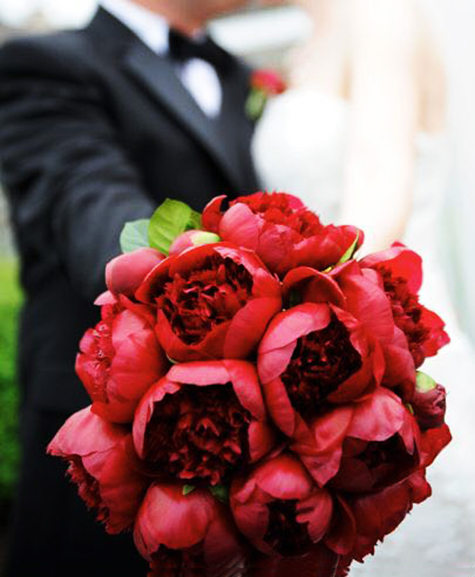 芍药花的花语是“美丽动人”,又有“依依惜别,难舍难分”之意。芍药手捧花中粉色、白色是最常用的,红色相对少见,但是炽烈红色跟白色婚纱搭配在一起能更洗净,硕大的芍药花瓣,在婚礼上想不吸睛都难。