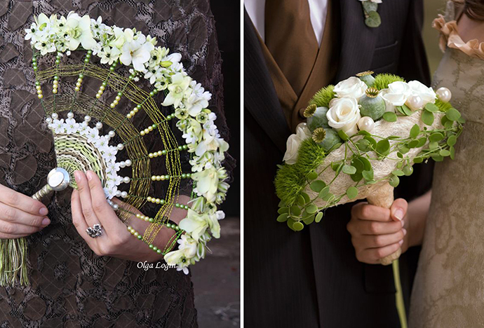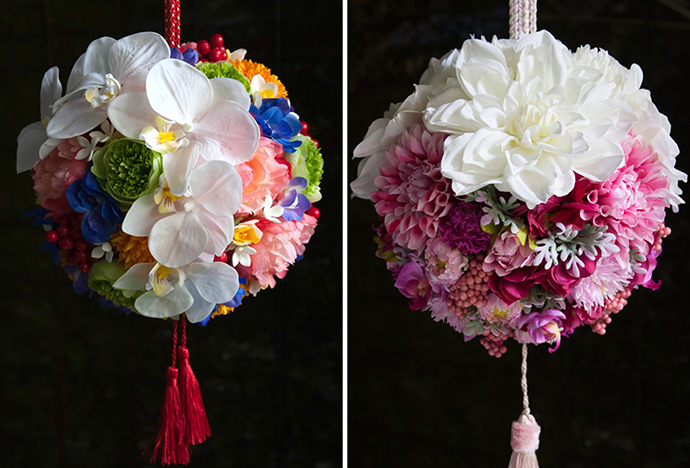 一般是将花材组合成花球,花球上系上缎带,可以手提或者挂在手腕上,非常俏皮可爱。在日式婚礼上更加常见。