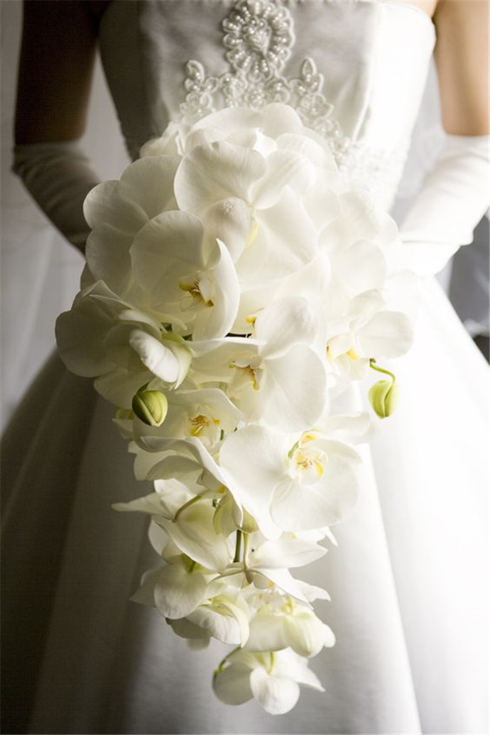 蝴蝶兰的花梗特别长,一个花枝上能开八九朵,状如翩飞的蝴蝶,非常适合制作瀑布型手捧花,高贵典雅又大气,身材修长的女生不妨尝试一下。