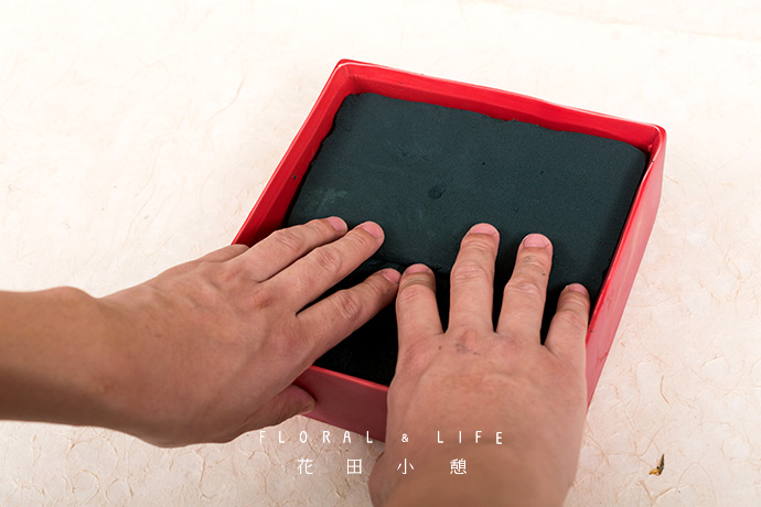 将准备好的花泥放入容器中,保重比容器略低一些。