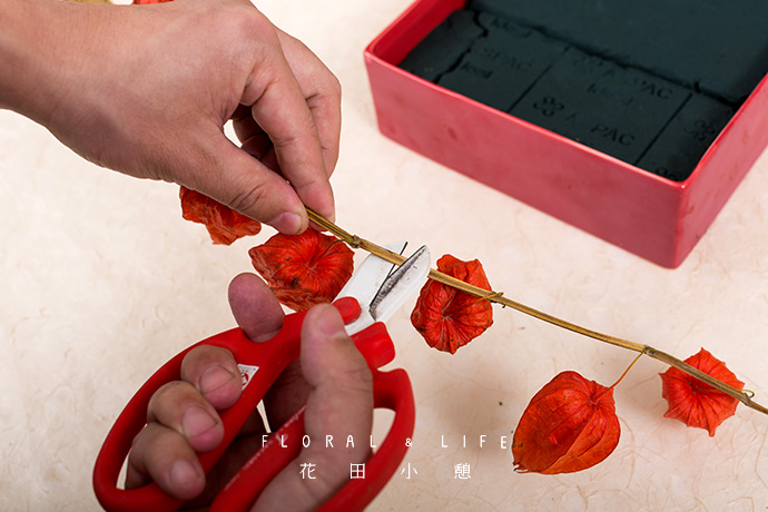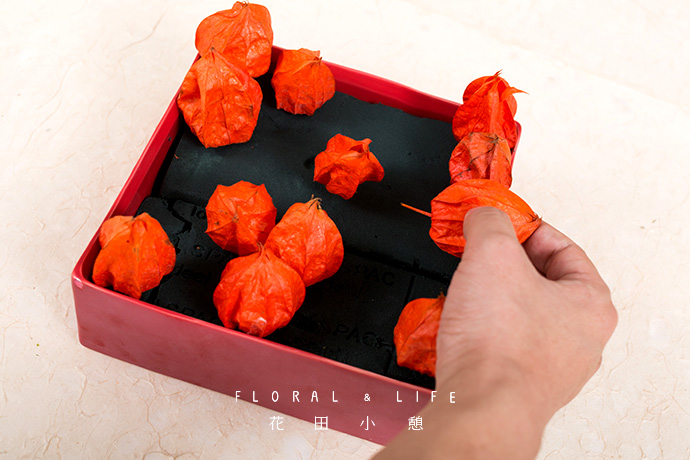 将灯笼果以三两支组合的方式均匀的插入花泥之中。