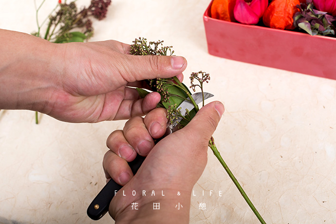 1.在作品的插制过程中,尽量避免同色系或相近颜色的并排摆放,保证不同颜色的花材进行搭配,如在红色花材较多的区域加入绣球、茵郁、珊瑚果,能很好的呈现作品的层次感。