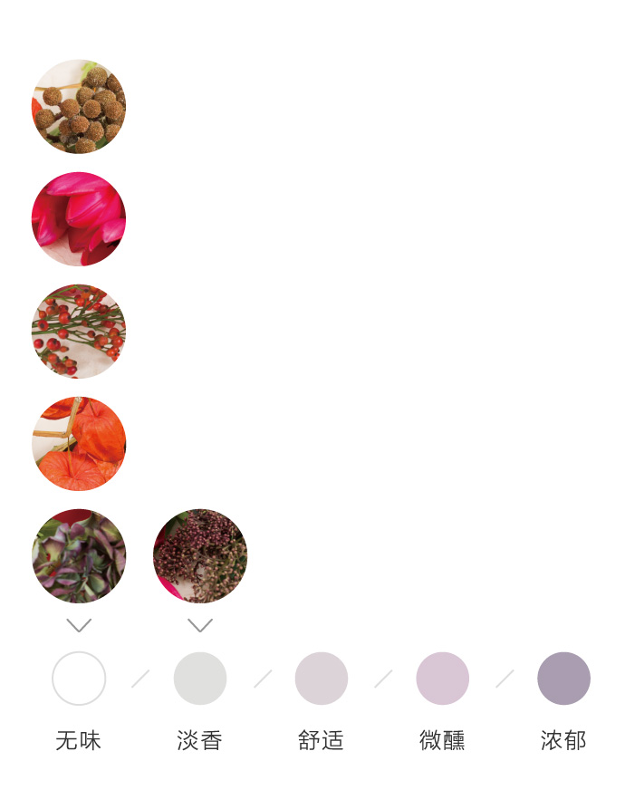 为了方便大家在花材搭配时的选择,花田小憩特设香味等级图谱,供大家在学习过程中了解更多植物的属性,以方便作品选择更适合的空间位置陈列。