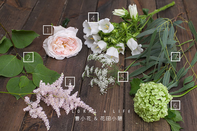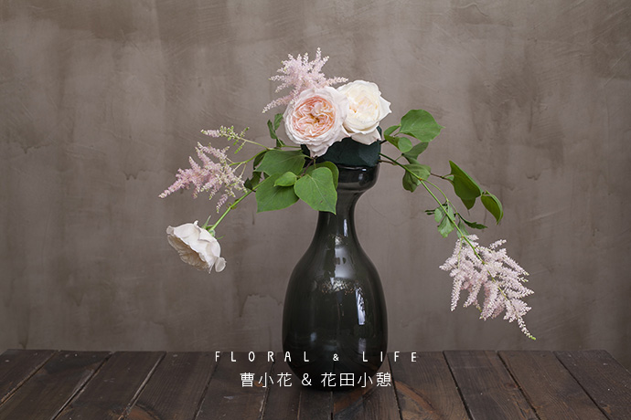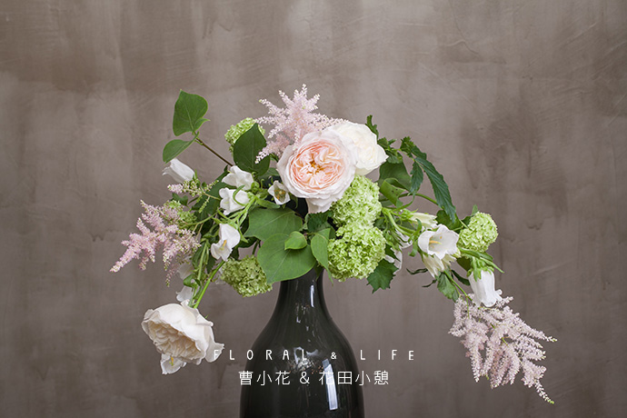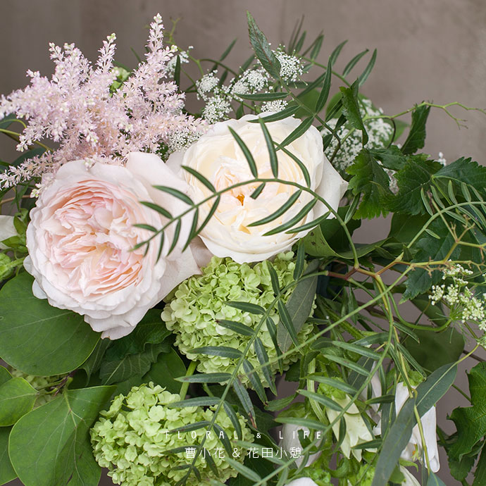 以不对称三角形为构图方式,左下和右下用玫瑰和落新妇确定造型的宽度和高度. 在造型整体左右和连接处,加入落新妇和丁香叶完成造型的初步框架搭建.