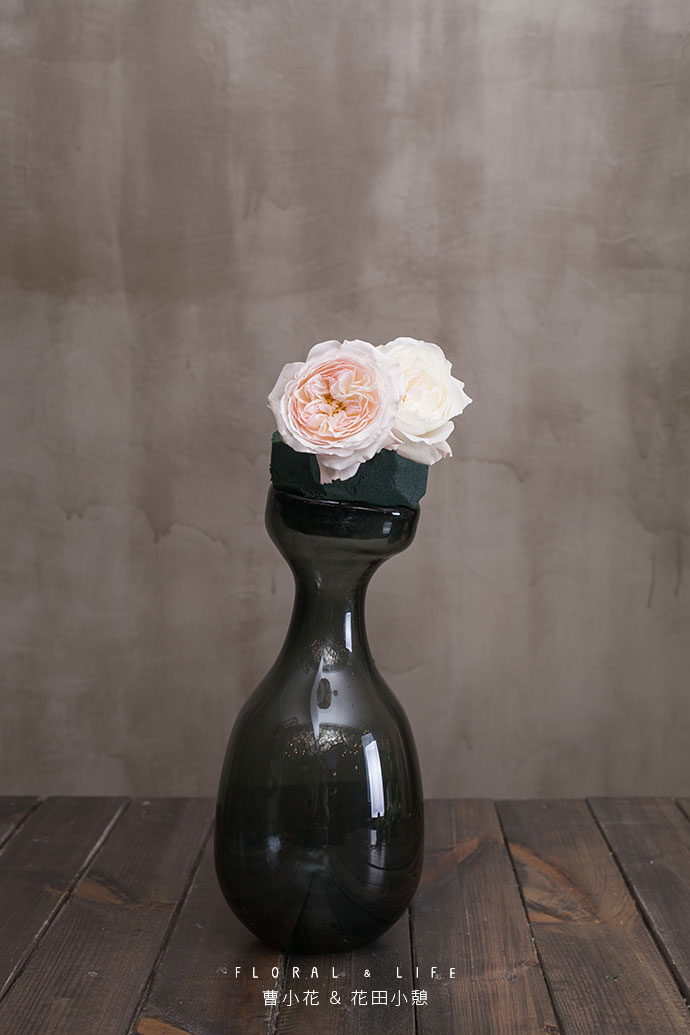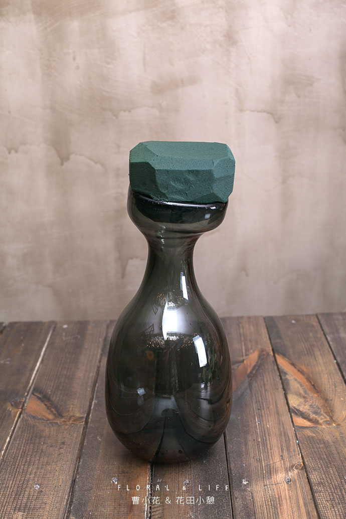 花田小憩气味图谱.准备一个适合的花器,加入花泥去棱角去边,以增加插花的稳定性. (花瓶是歪的)