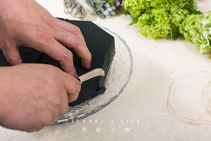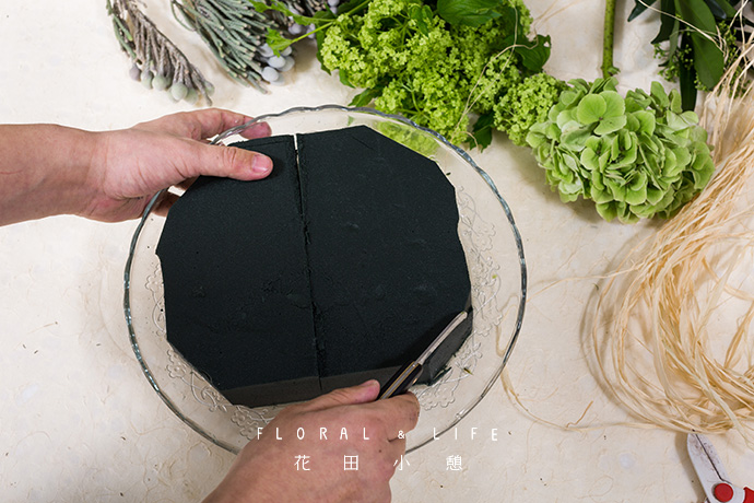 把花泥处理成八边形,方便在花材插制过程中拥有较大的空间。
