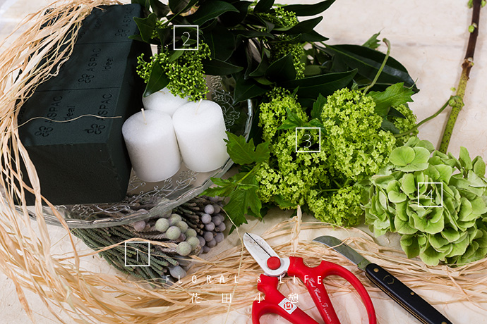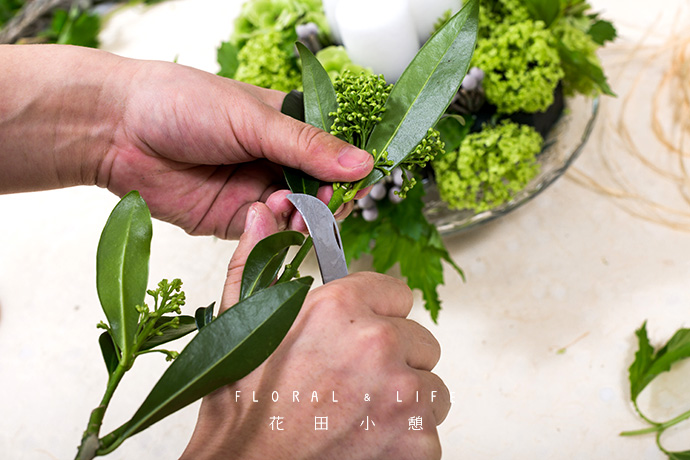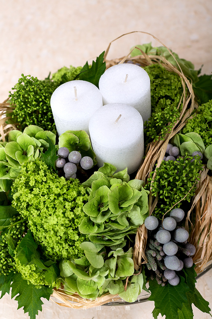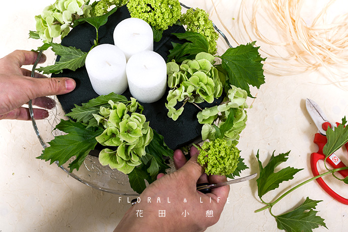 将洁白的蜡烛放入正中央呈三角形,在花泥的侧面分别补入绣球花和木绣球。