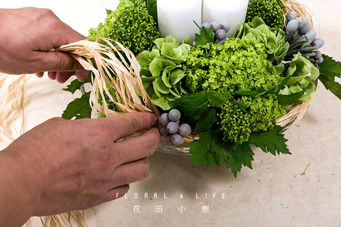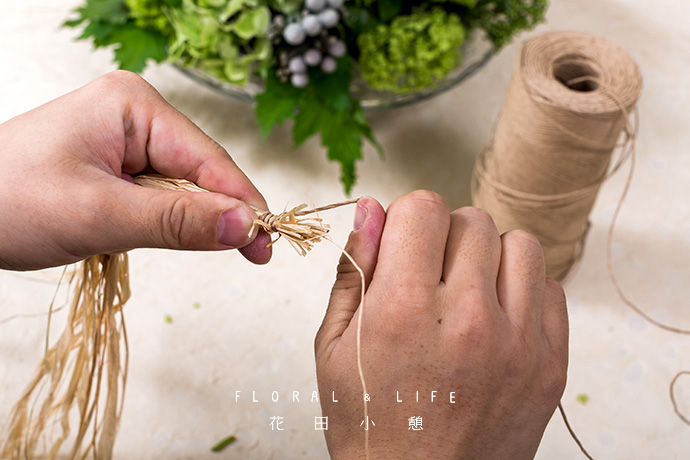 将拉菲草缠绕作品底端2/3处,再平放入花材之中并呈