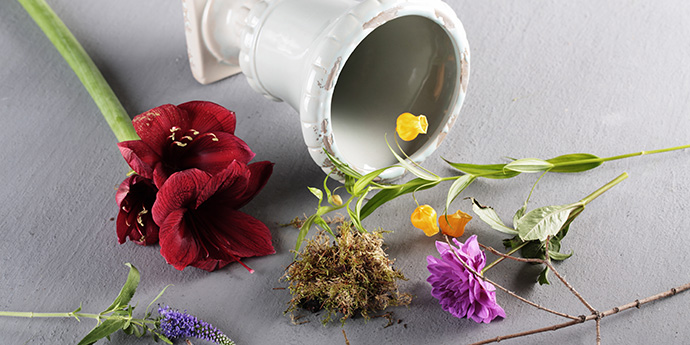 在右侧2/3处插入宫灯百合,并与朱顶红保持平行。